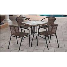 посадочных мест - 4, труба - сталь с полимерным покрытием, столешница по периметру без ротанга с отверстием для зонта, стекло закаленное - 5мм, цвет - прозрачный, без ротанга на подлокотниках |