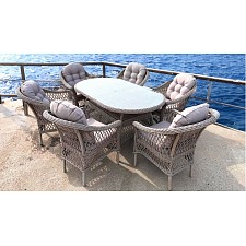 посадочных мест - 6, подушки в комплекте, сверху столешницы стекло закаленное, цвет - прозрачный |