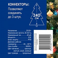 Особенностью модели является возможность соединения нескольких гирлянд между собой, что позволяет создавать масштабные световые композиции любой протяженности. Работает от сети 220В через сетевой кабель, степень защиты IP20 гарантирует безопасное использование в помещениях.