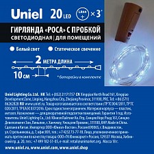 Особенности модели. Гирлянда оснащена двадцатью современными светодиодами, создающими равномерное белое свечение без мерцания. Медный провод гарантирует долговечность и надежность конструкции. Питание от трех батареек типа LR44 обеспечивает автономную работу. Степень защиты IP20 гарантирует безопасное использование внутри помещений. Пробковое крепление позволяет легко зафиксировать гирлянду на любой поверхности.